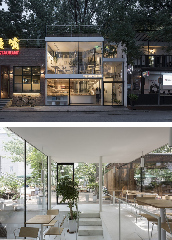 整个空间轻盈透明,透过全层高落地玻璃外立面可欣赏街外流动的风景,配合灰白泥墙、背景灯光等技法、素材运用,完成空间内虚实交错的界定。大小高低各异的空间,趣味盎然的楼梯穿梭在绿叶枝桠之间成为空间内的戏剧化元素,让人与树木产生不同角度的亲密接触。家具采用天然朴质的原生木料,简单素白的瓷砖,摒弃一切装饰与华丽,追求高度真实且单纯自然的美。