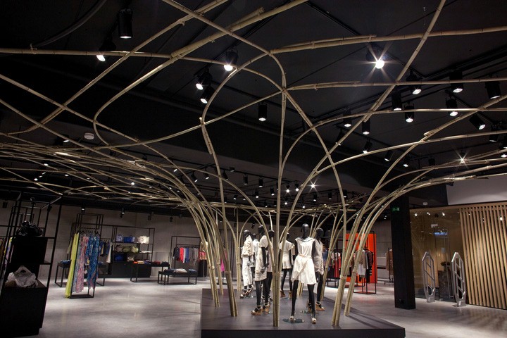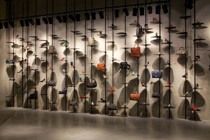 服装店铺设计空间造型中间辐射线性引导顾客动线,流线型造型设计增添店铺设计感,配件区整齐排列空间感线条拉伸空间动感线性,店铺设计的动线合理划分。
