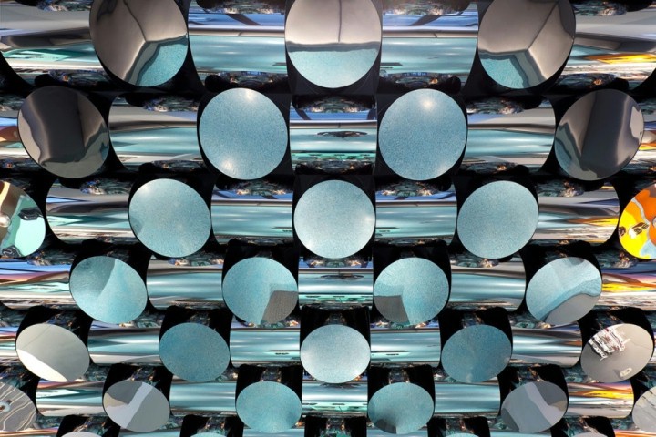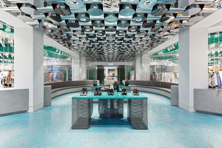 店铺设计空间划分合理 点状整列分部,镜面反射材质拉伸空间感,整体色调轻快,店铺中心区域设置展示DP休息相结合,起到人流引导,动线两侧分部,透明亚克力隔断保证私密性,通透性,起到自然隔断,地面水磨石彩色生动有趣。