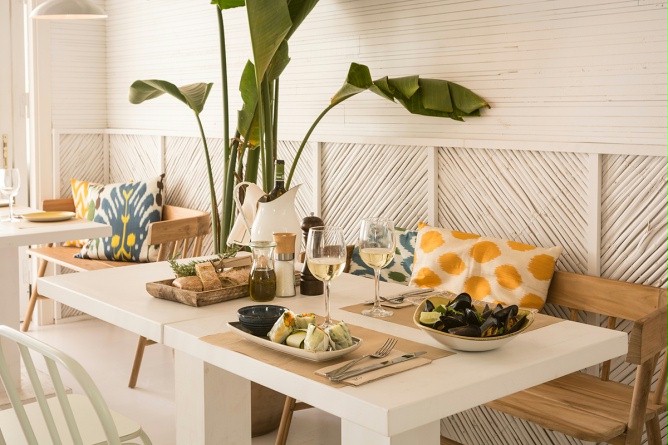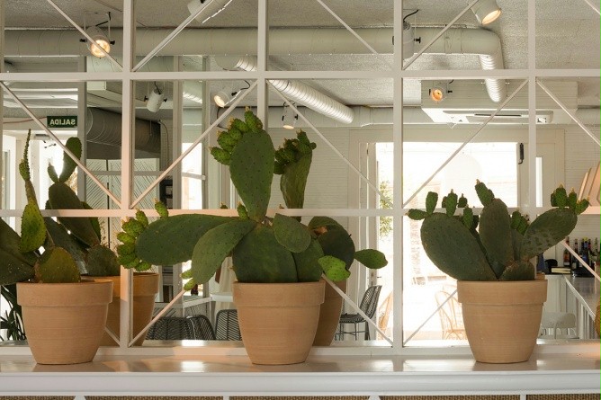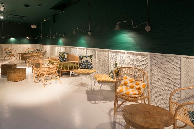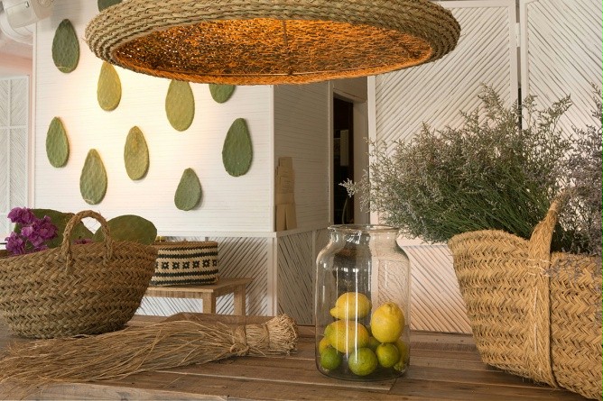店铺设计以田园式风格为主,竹编草编的元素加入其中,让我们再次回归自然。极具造型感的灯饰使这个空间气氛活泼跳跃,加上仙人掌植物的点缀,夏日清爽惬意的气息都扑面而来。
