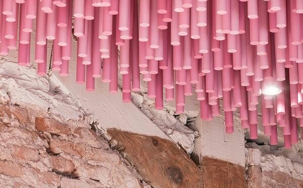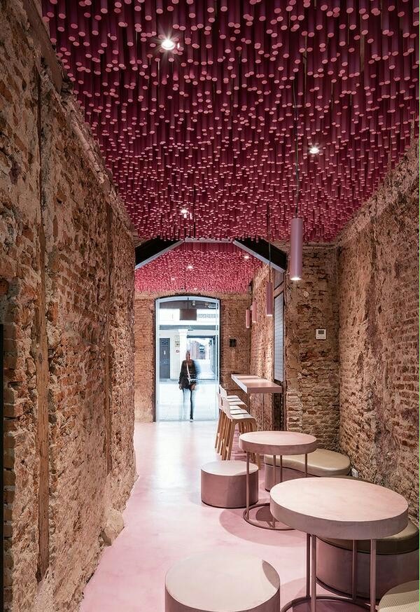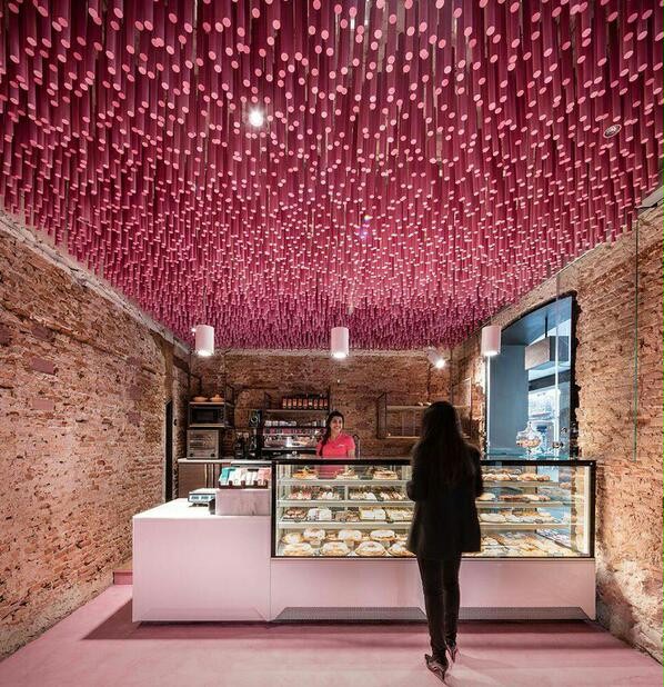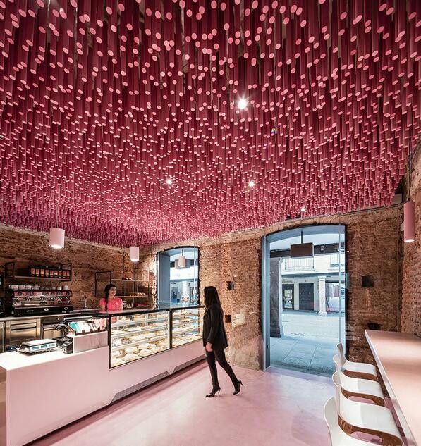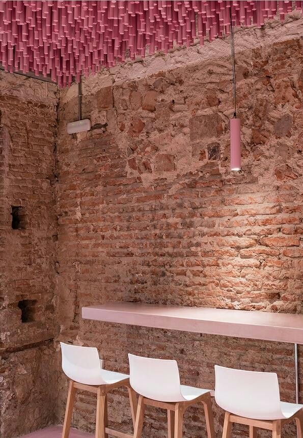 店铺设计是由极具历史背景的房屋改造而成的,色彩鲜艳的现代面包店设计特色氛围由12000根粉色木棍组成的“珊瑚礁”和保留原始的历史感墙壁形成。“珊瑚礁”从入口呈波浪状延伸铺满天花,每根高度略不同,空间灵动,增添有趣又优美的独特个性,这也是吸引人群的关键所在。空间相应搭配粉色木棍形态以及穿插的灯光效果。颜色相似的座椅和吧台。粉色的光彩流连在古老的墙壁上,散发出复古而浪漫的气息。