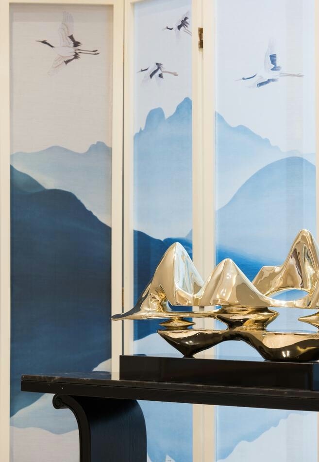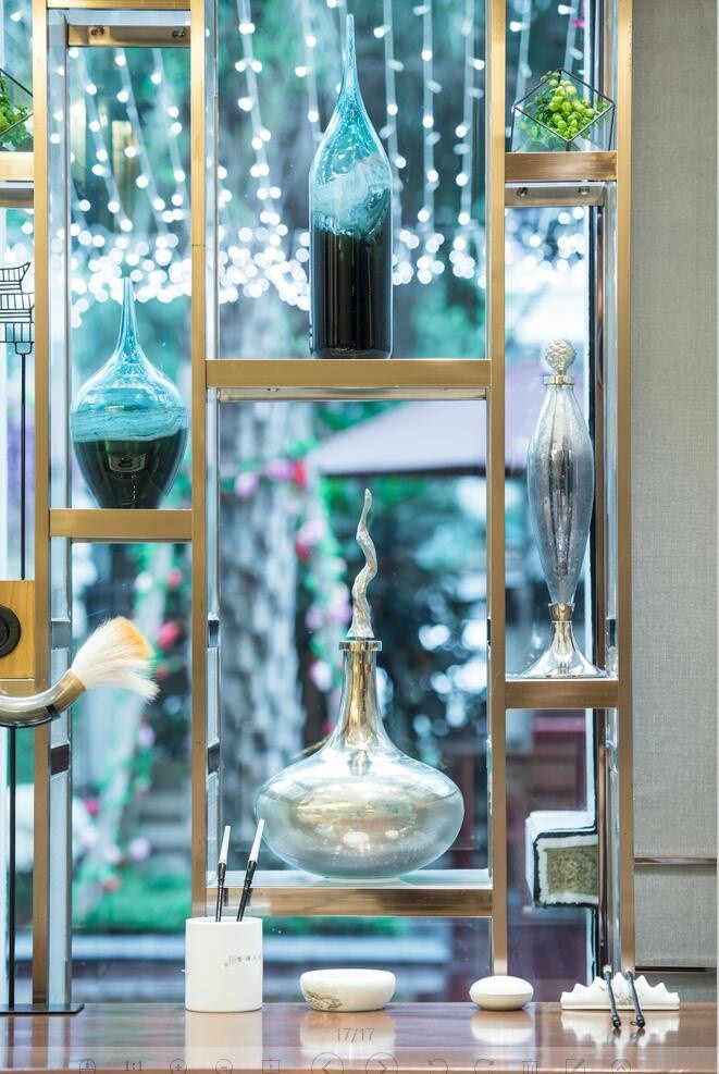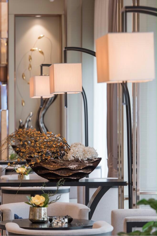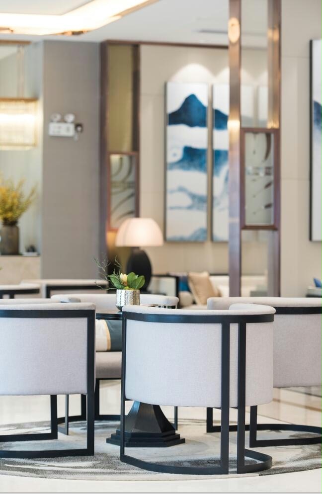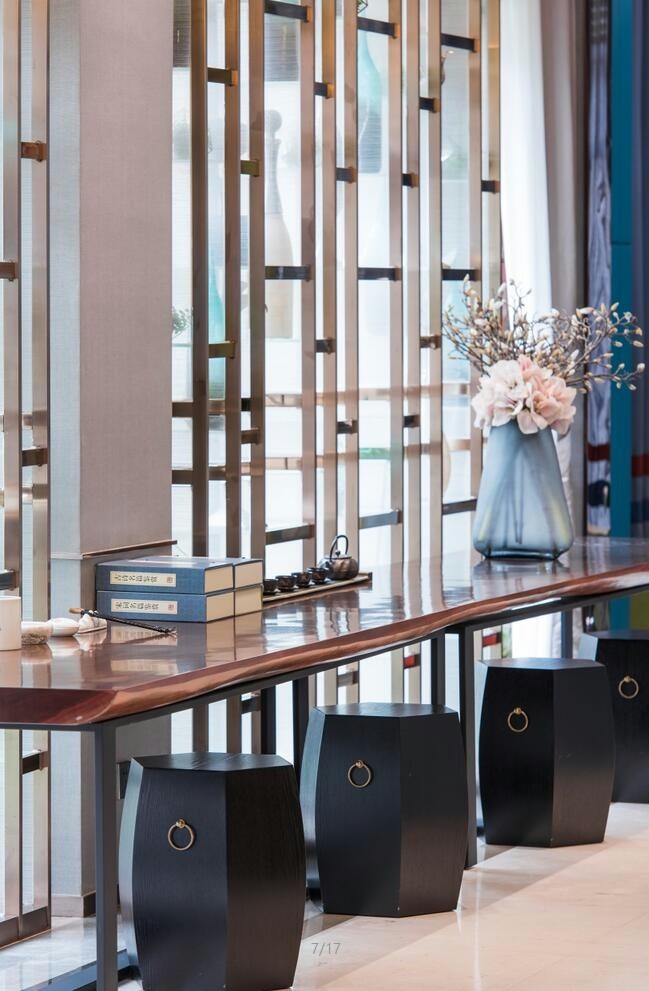 售楼处设计多处运用丝质布料与木质结合的中国传统元素软装, 剔透的水晶灯沉稳的现代装潢,高档的材质运用体现着现代人的品味,精简的线条造型呈现着现代人的干练。中国文化与现代文化的交融,传承与发展碰撞出的空间,很好的诠释了时尚东方,灵动东方的内涵。
