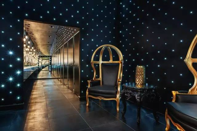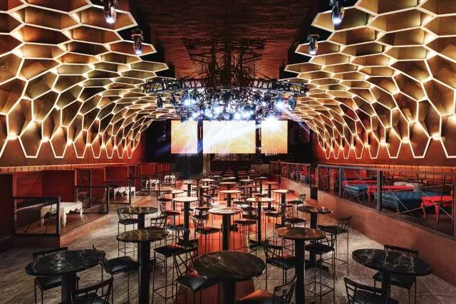 商业空间设计 走廊通道设计以层层叠叠的木质面板组合以自然的方式拼接在一起,创造出动感的三维效果。空间上使用了双镜面,造成视觉上的有无限延长感。主区域墙面使用六边形蜂巢样式网格装饰元素与顶灯融为一体,点亮了重要区域与音乐相辅相成。吧台区域墙面上活泼有机线条挂毯为室内设计增添层次感,金色的吊灯成为空间的点睛之笔。