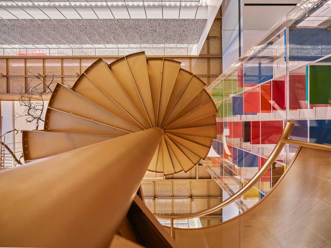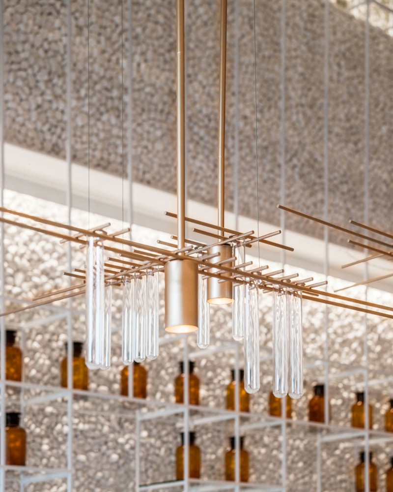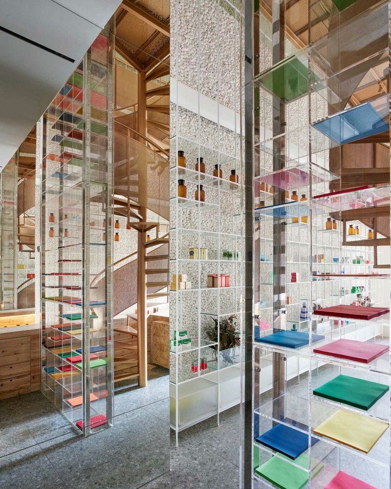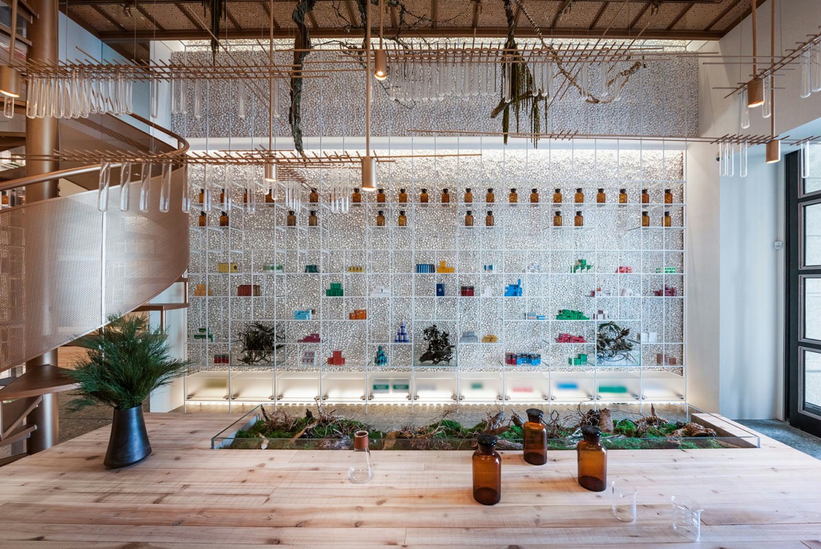 店铺设计以推翻药店传统的图像捕捉新的和令人兴奋的气氛。就像分子拆分和重组的“分子”和“治疗”,从设计的方法返回到药店–提取分子性质以综合为药物医治的初衷。在内部,设计师将“原始”与“技术”的看似矛盾的品质结合起来,这是由分子合成形成的新型复合药物的象征。改变分子形状,如三角形到多边形,球体到圆锥体,在空间中被采用。高耸的鹅卵石墙提供了一种朴实的质感。金属楼梯和透明的亚克力展示架作为一种解毒剂,以展示架的空间几乎消失,有五颜六色的药物作为绘画色彩的墙壁带来的生活。这里避免了传统药房柜台服务的单向模式——空间的核心是药剂师与顾客互动的实验台。再加上开放分发区、咨询服务系统和交互式信息功能,创造了新的客户体验。实验台是由一百年前树干原始皮质的实心木材堆积而成。一起挂的绿色植物,有一个森林里的回忆。