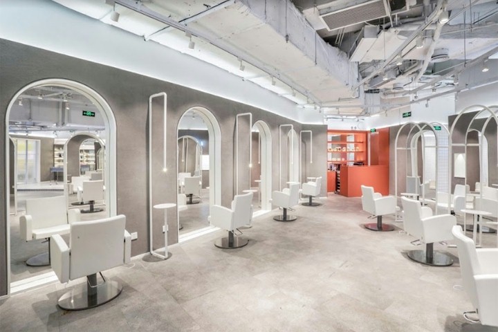 在整个空间中,“定制”的设计随处可见。入口半圆拱的门面形状设计与标志白漆手柄匹配。不同的色调搭配将沙龙内部的不同区域分开,每个区域都有其独有的色彩搭配和主题风格。