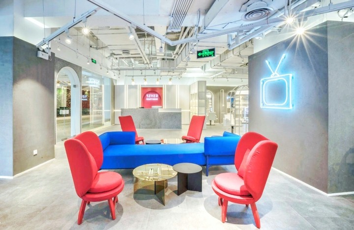 从定制沙发到软背景墙,采用红色和蓝色两种。这种对冷暖色调的协调,为等候区的顾客营造了良好的心理氛围。当然,设计师已经设计出了清晰的空间布局,让等待的顾客不会觉得无聊。并且,在等待区域的一侧设置一个自动计时器区域。在这里,霓虹灯的图腾,各种柔和的装饰都可以成为自拍的最佳道具。