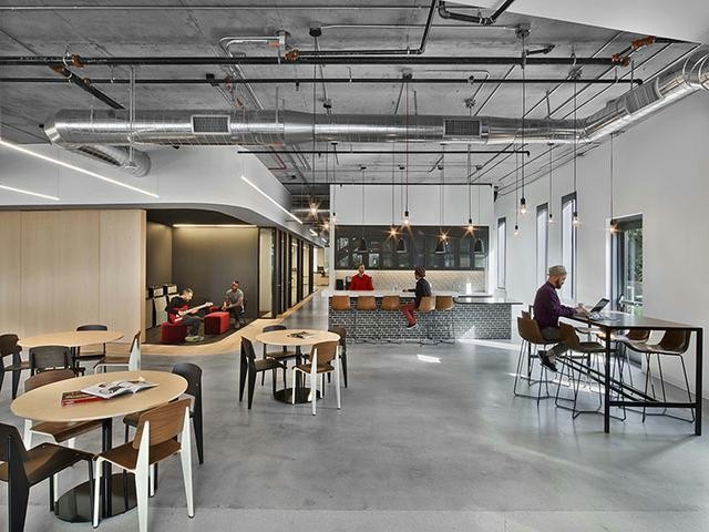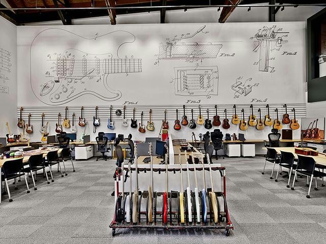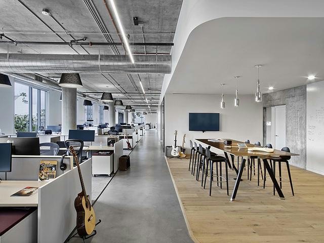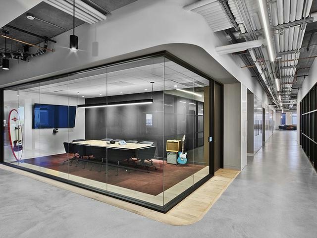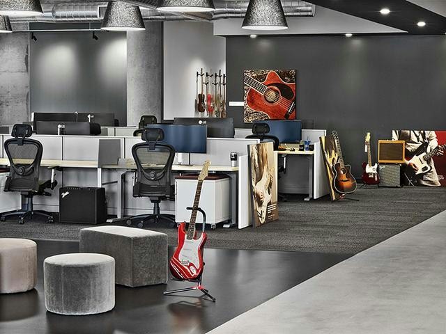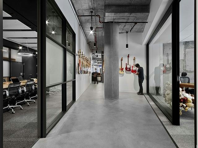 商业设计以简约的工业风为设计主导,简约而细腻的配色、柔和的弧线转角、壁龛式空间构造。使整个工业设计充满了柔和而不冷淡。在办公空间处设计了向外音乐爱好者的开放的公共区域,超高的室内空间,墙面绘制者吉他的构造细节,吸引人眼球。