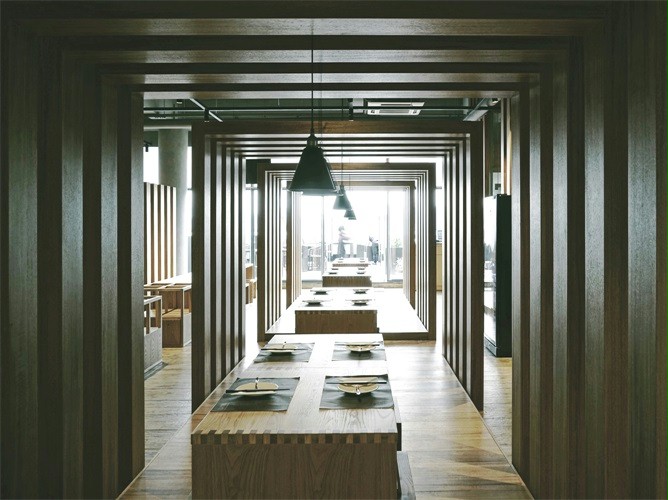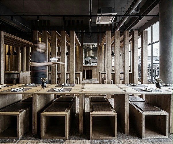 店铺设计大面积采用木质材料。造型上线性设计结构,使整个空间采光上得到充分保障,分隔的区域可为食客提供半私密的空间,座椅的设计简洁大气,人性化的设计也极大的利用了空间的收纳,建筑保留原有的混凝土天花板和墙壁,在表面做简单的处理,与木材天然原始完美结合。营造出宁静质朴的就餐气氛。