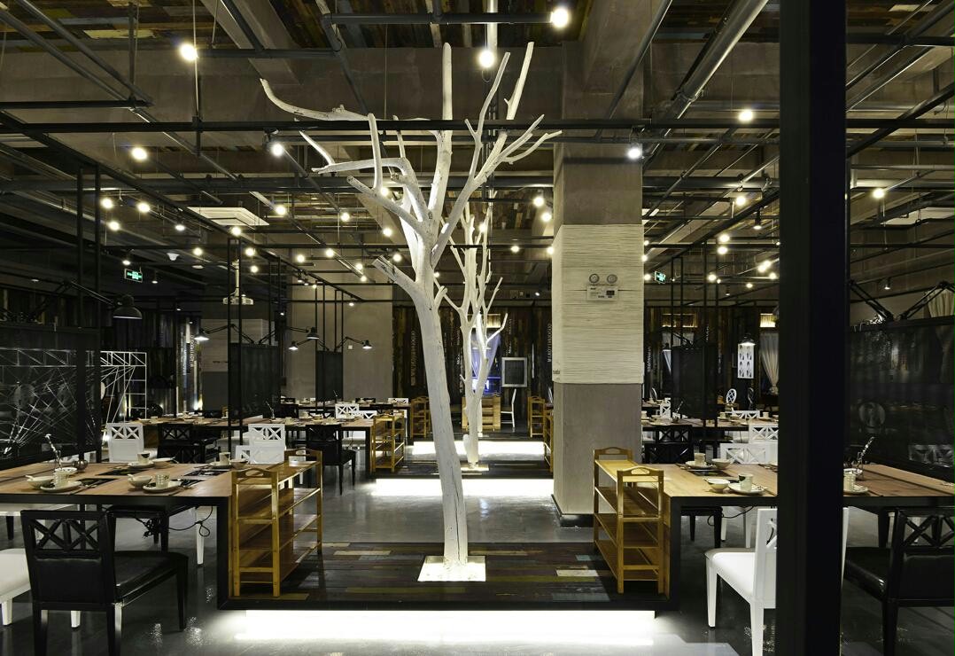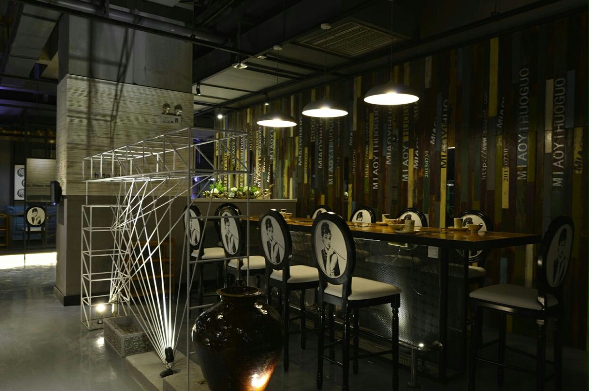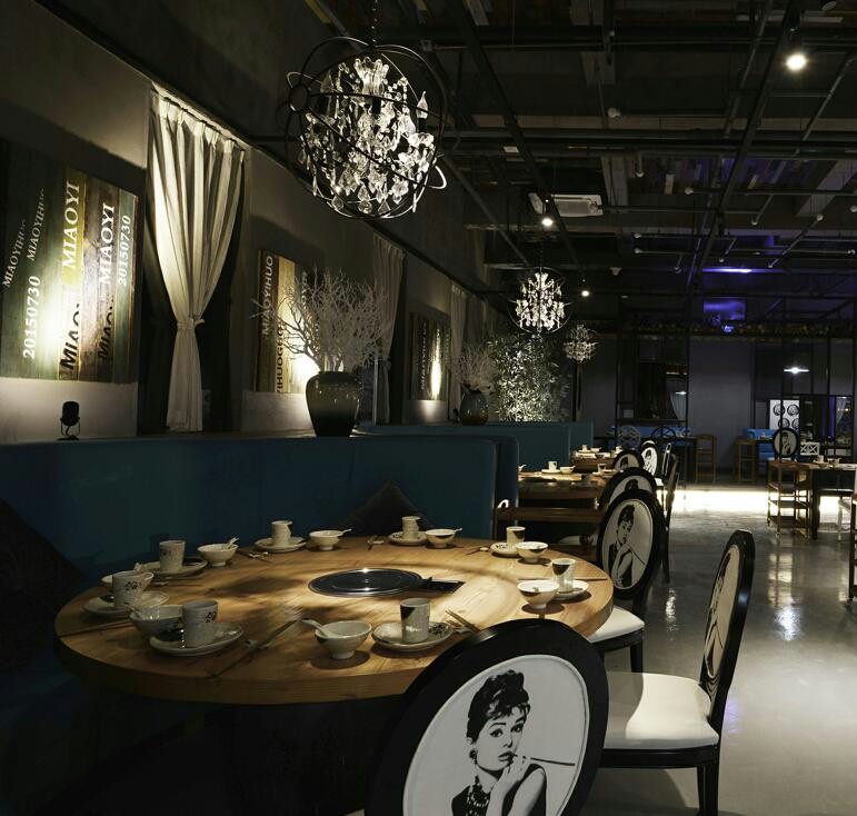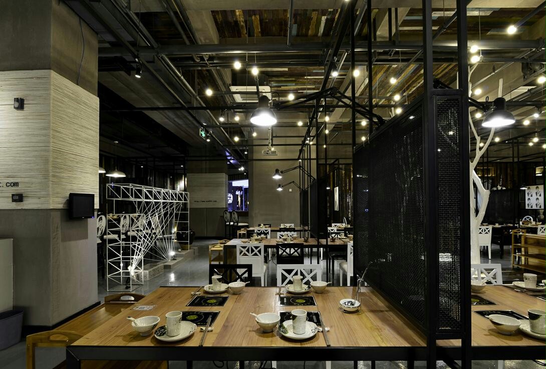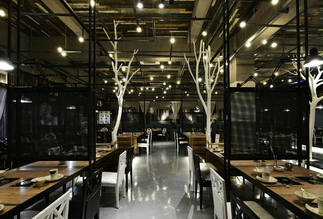 商业设计理念是以后现代的工业复古时尚风潮来吸引年轻的消费群众。运用自然的材料来突破传统意义上的装饰,如树、老木、钢网等水泥废旧材料,与当代时尚元素跨界的契合。空间的整体基调是黑白灰,但三棵白树的安排巧妙的点缀,又使冷漠的空间多了份色彩。赫本的头像透视了古典气息,与主题火锅天然合成,店铺整体透着复古时尚的味道,让人过目不忘。