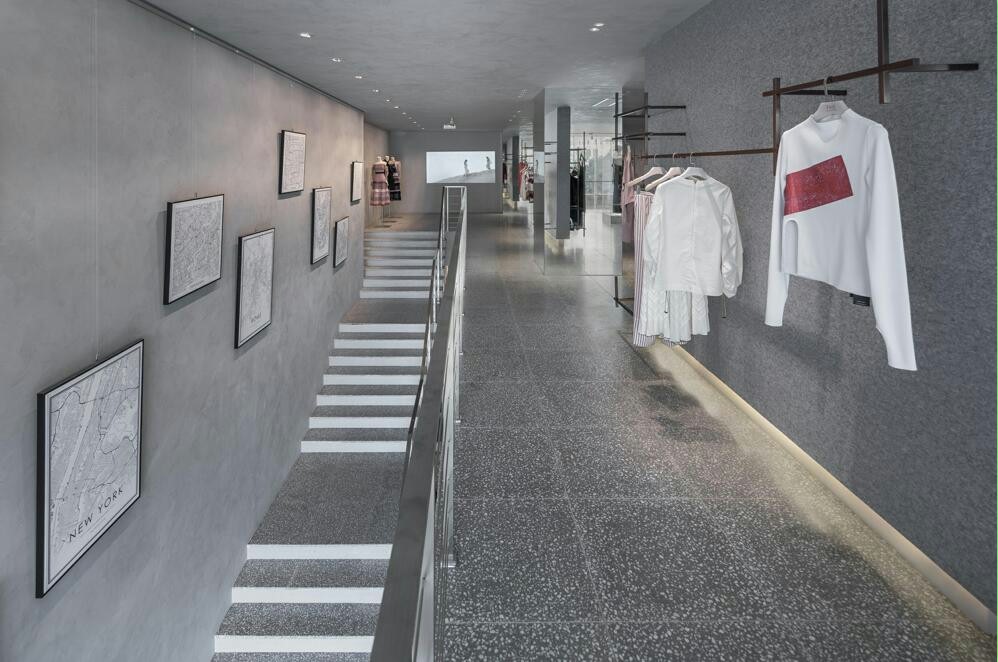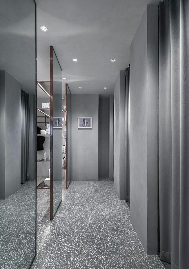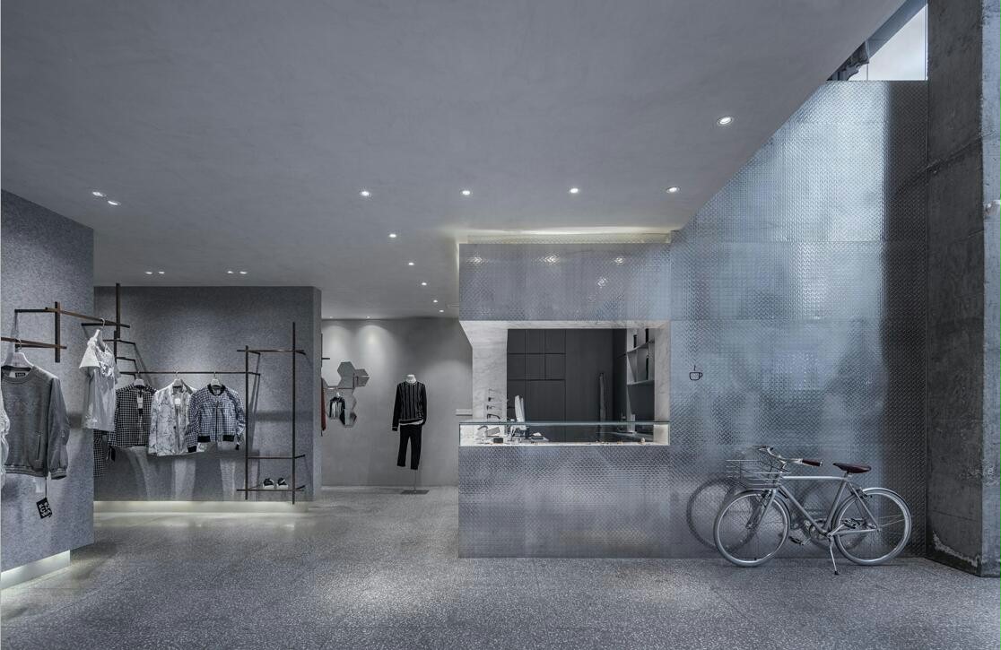 商业设计理念是用艺术的方式来设计时尚买手店。不同灰色系材料呈现出丰富的层次和质感,使得空间的质感丰富且细腻。毛毡、水磨石、花纹铝板、波纹铝板、清水混凝土、艺术涂料、木材和大理石等材料,在空间里交错组合,共同营造了一个微妙的“灰”空间。在自然光和人工照明的配合下,这个灰色的空间透出淡雅宁静的气质。同时灰色“艺术馆”空间所具有的仪式感和神秘感,使得陈列其中的商品获得了艺术化的升华,增强了设计师服装的品质感,有效的提升了人们的购物体验。