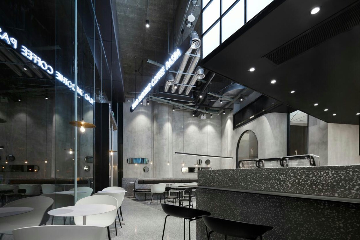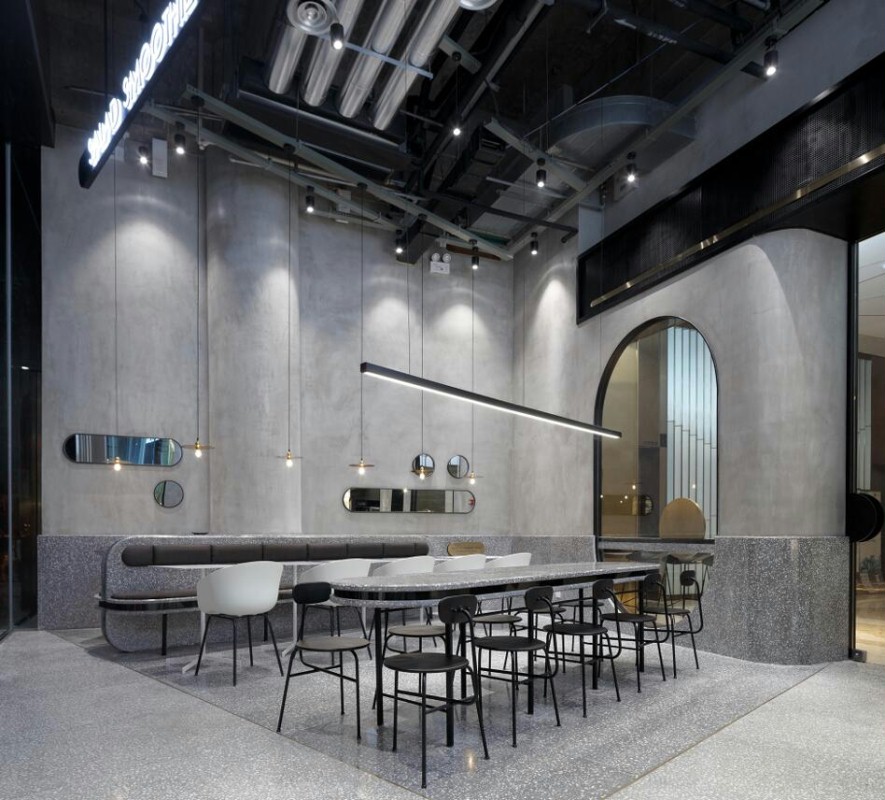 商业设计理念是创造一种自然纯粹又时尚的品质生活理念。主材料选择上,大面积运用了水磨石,水磨石板材之间采用黑色金属收边作为夹心,增加整体轻盈感与品质感,也看起来更精致。就餐区以时下流行的灰色作为主色调,呈现品牌所需的简洁感。同时为了避免灰色调所带来的单一与平淡,采用不同色度与不同材质来丰富层次感。整体的环境给顾客无负担、无压力且更具营养更享受用餐的过程。透露出一种积极、阳光、活力的生活态度。