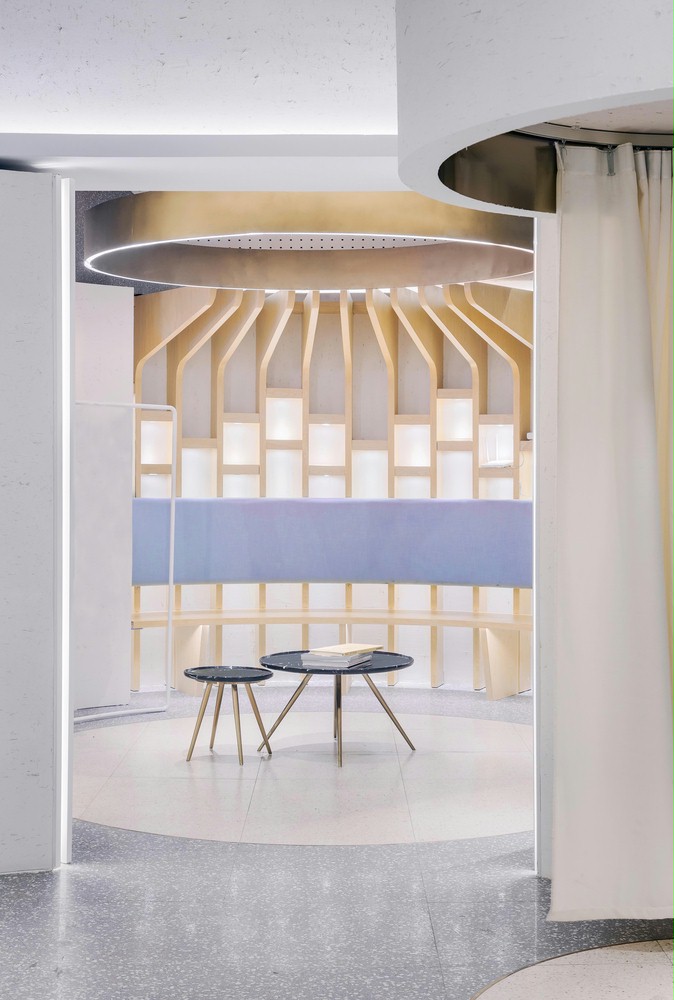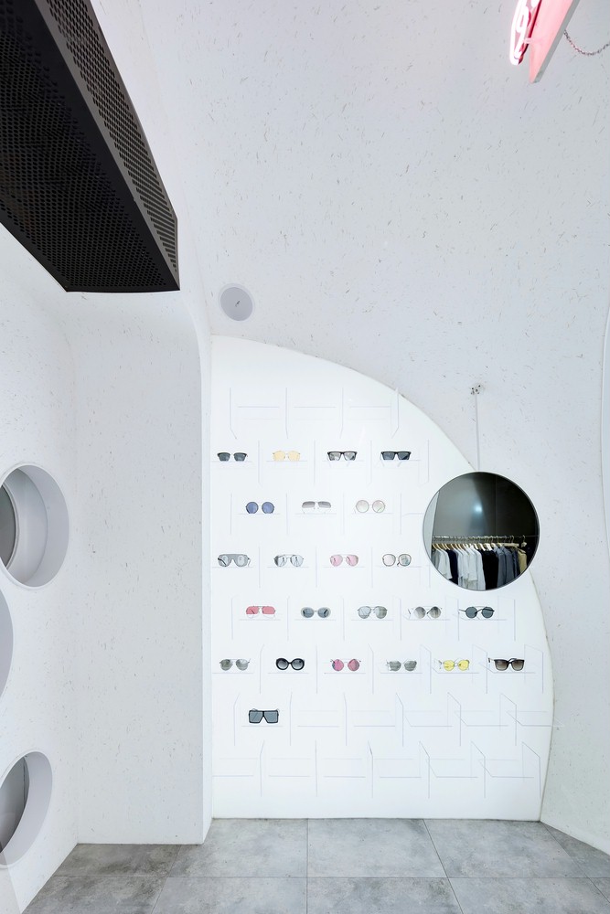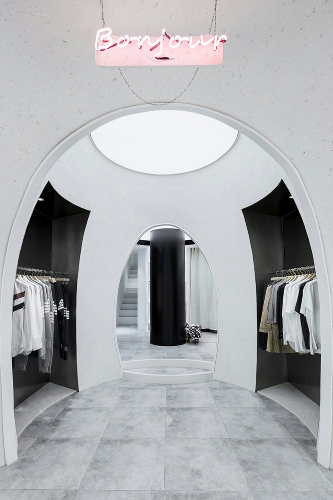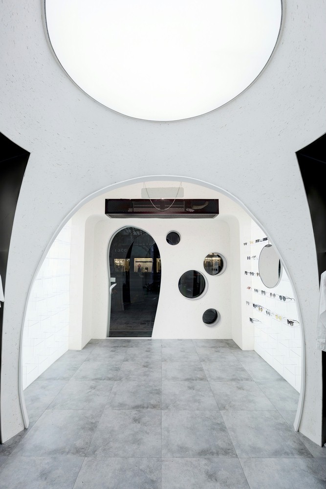 店铺设计创意点三个椭圆形的球体。发光的天花板提供了柔和光线的内部,描绘了几何学的清晰轮廓。圆形组合与场地的曲折边界相容,提供了强烈的主观几何秩序,穿过一条长长的走廊,仿佛穿越时空隧道,从一个星球走到另一个星球,开启一场奇幻之旅!