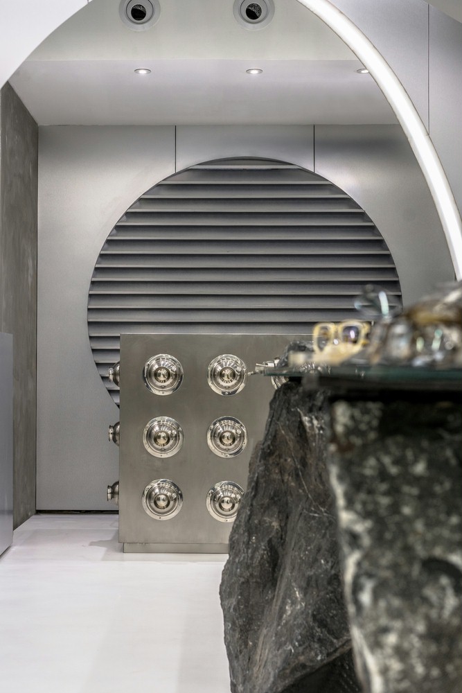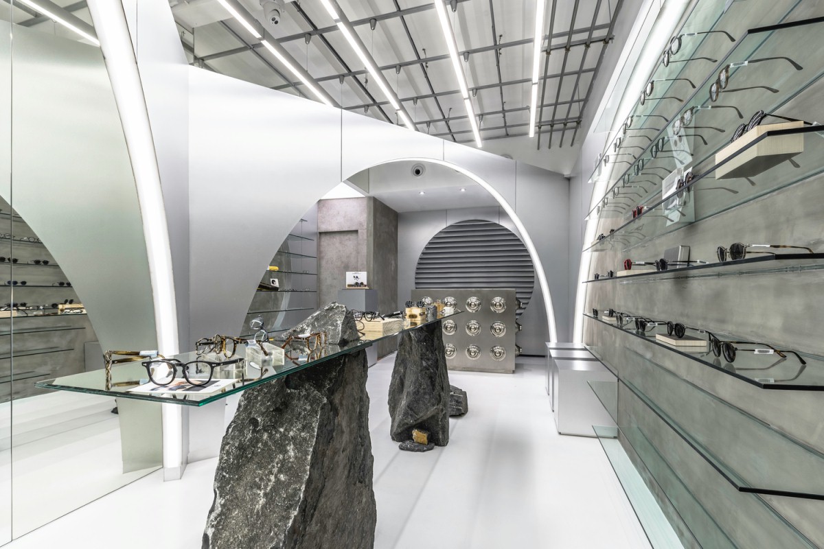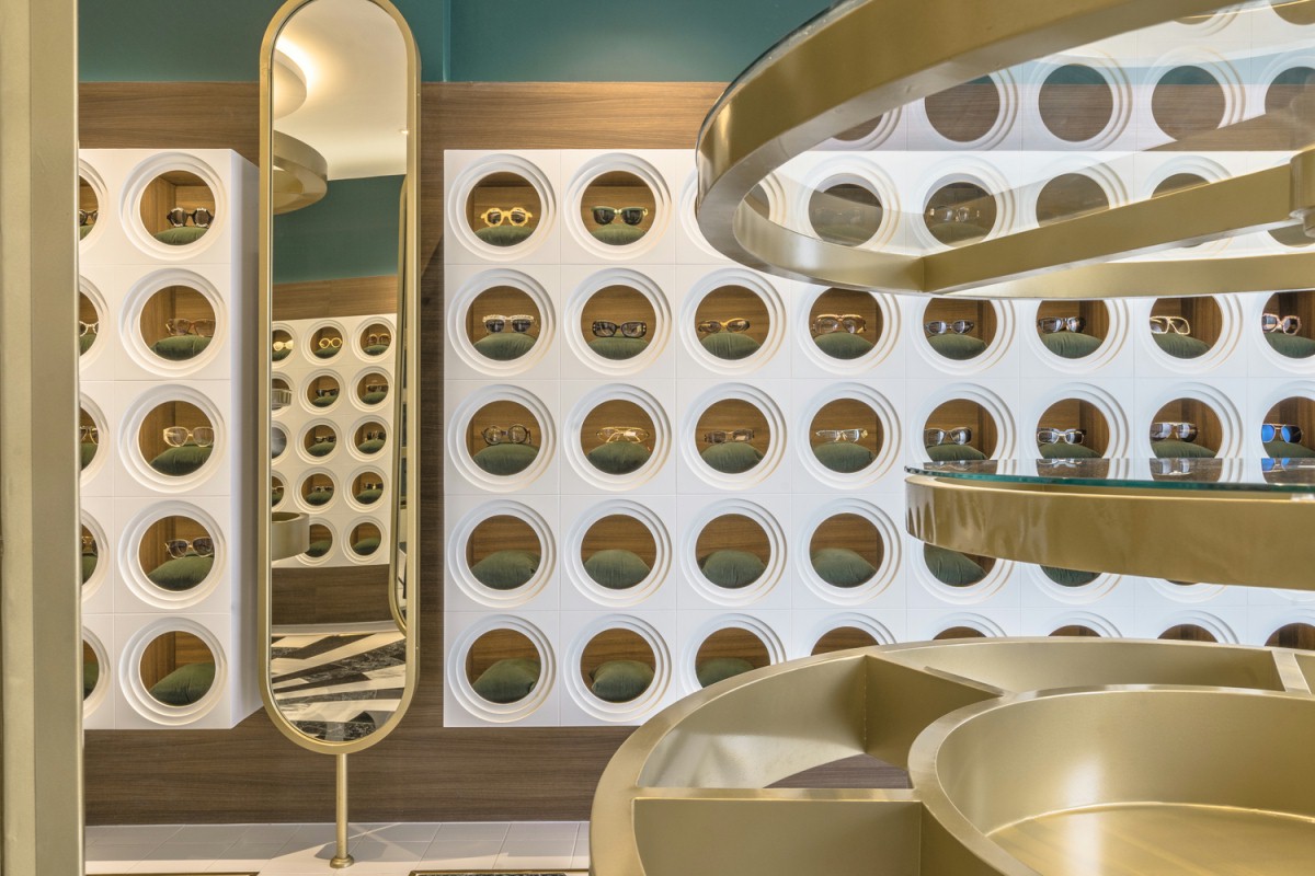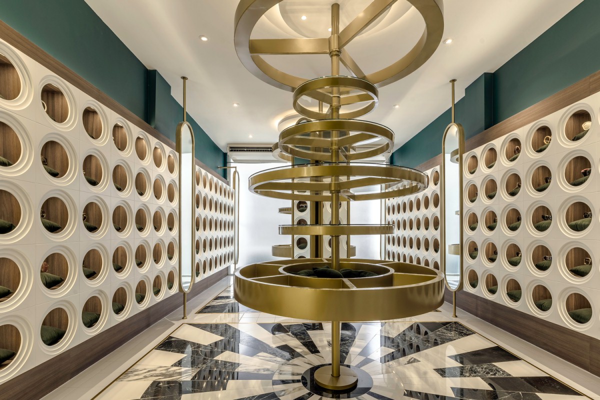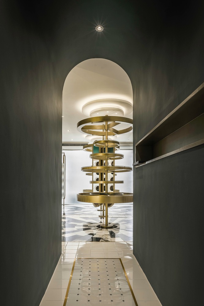 设计理念/购物中心的设计风格有有是科技感的味道,豪华的异国情调和超高的品质让人念念不忘。一共有四层空间,每一层楼都有自己的产品和功能设计。核心概念是“圆”。眼睛的简单形状,焦点,无限,旋转和统一,运用金色、单色大理石、深色木材和橄榄绿为特色的复古材料给人超现实的氛围。