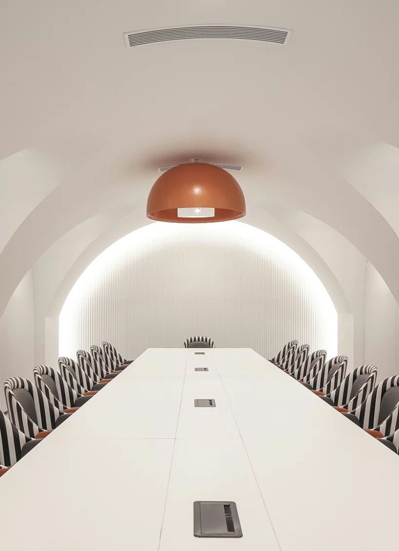 四层空间的办公室,每一层都注入了不同的色彩。入口通往餐厅空间,以一个形状像热气球的大型艺术装置为特色。电梯附近的空间也是一个公共接待区,周围有大面积的办公区域,让每个公司的员工都可以非常方便的到达自己的工作区域。通过大面积的木皮贴面和灰褐色的混凝土涂层,赋予这一楼层整体空间稳重成熟的氛围。运动空间的展示,让员工可以锻炼身体,为办公空间增添了一份活力。