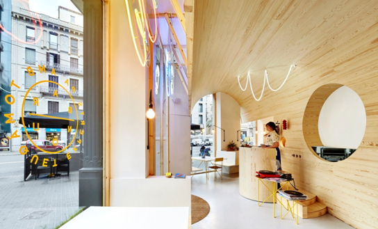 打破了方正空间的束缚,不同曲线不同弧度的木板由立面延续到天花,空间被三个面摆布出活力,空间中的行走方式极其顺畅。自然环保的木材料传递了轻松自然、生机童趣的特性,让空间不显得死板,有弹性,有空气感。